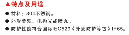 ●防護(hù)性能符合國(guó) 際IEG529《外殼防護(hù)等級(jí)》IP65。