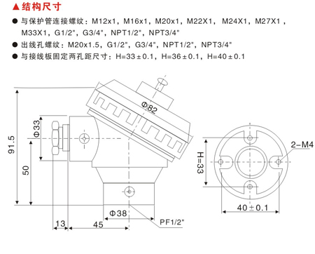 與接線板固定兩孔距尺寸: H =33±0.1,H =36±0.1,H=40±0.1