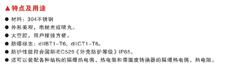 ●還可以裝配各種結(jié)構(gòu)的隔爆熱電偶、熱電阻和帶溫度轉(zhuǎn)換器的隔爆熱電偶、熱電阻。