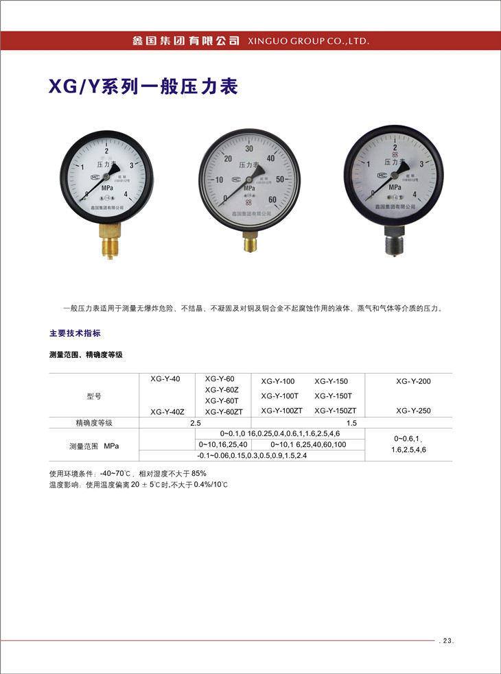 XG-Y系列一般壓力表,一般壓力表適用于測(cè)量無(wú)爆炸危險(xiǎn)、不結(jié)晶、不凝固及對(duì)銅和銅合金不起腐蝕作用的液體、蒸汽和氣體等介質(zhì)的壓力。
